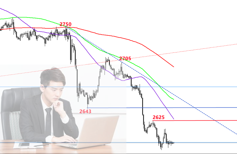 黄金众头反弹以乏力,空军当者披靡,依然进入下跌3浪阶段。那么操作上维系看空思绪,今日反弹2610左近空,再则即是2625隔日高点压制,下方体贴2590跌破状况,跌破将加快下行。