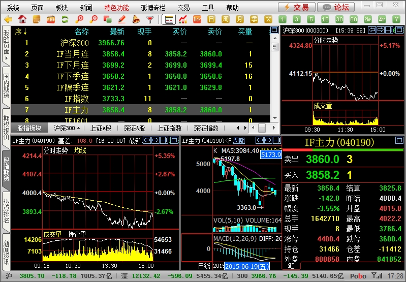 1、点击左侧“股指期货”按钮即可进入股指期货页面,本页面包括了股指期货报价页面、IF主力分时走势图、IF主力K线走势。