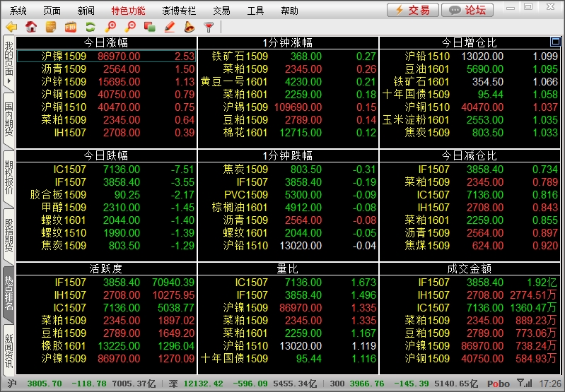 2、本页面为九宫格形势,只针对主力合约举办排名,排名实质区别为今日涨幅、今日跌幅、生动度、1分钟涨幅、1分钟跌幅、量比、今日增仓比、今日减仓比和成交金额。