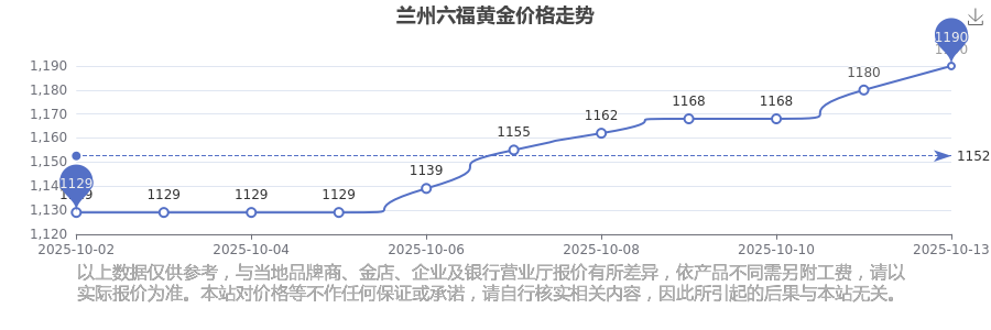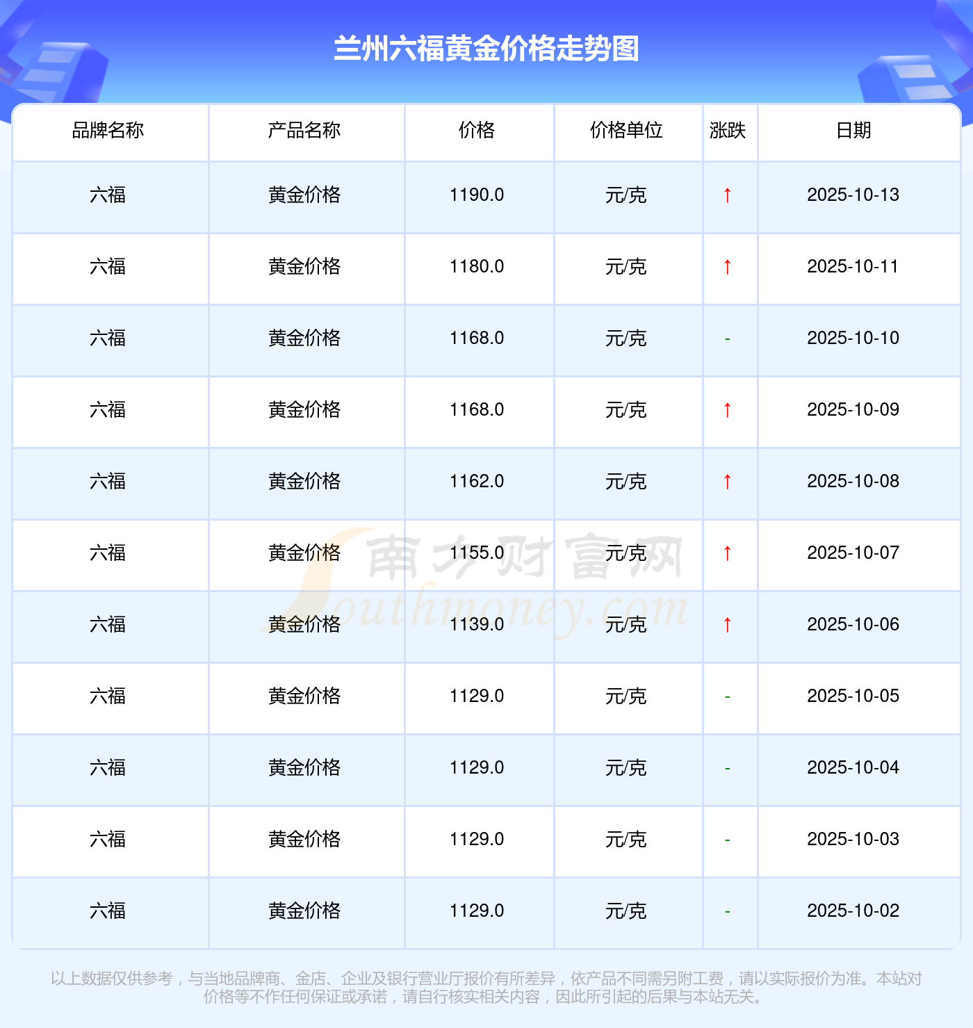 于 2025年10月13日,兰州六福黄金价值的克价为1190.0元/克。