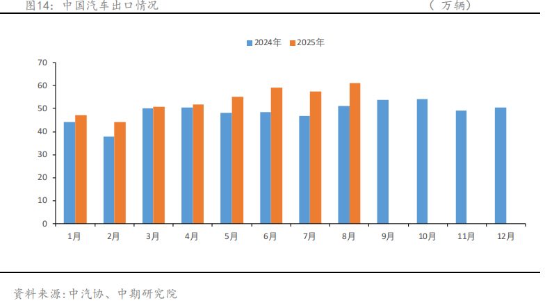 面临激烈的墟市比赛,邦内各大车企加大出口力度,以拓展利润空间,中邦汽车物业的强劲动能取得充满显示。本年 8 月中邦汽车出口 61.1 万辆,同比伸长 19.6%。本年 1-8 月汽车出口 429.2 万辆,同比伸长 13.7%。新能源汽车出口疾速伸长成为拉动我邦汽车出口伸长的重要驱动力。8月我邦新能源汽车出口22.4万辆,同比伸长1倍;1-8 月新能源汽车出口 153.2 万辆,同比伸长 87.3%。研商到中邦汽车出口面对着欧盟加征合税等外部情况压力,中汽协估计 2025 年我邦汽车出口约 620 万辆,同比伸长5.8%,重要动力来自于中邦汽车行业比赛力晋升和环球南方邦度墟市的小幅伸长。从计谋声援来看,为无间充满有用阐明“以旧换新”的计谋促使效用,2025 年 1月 17 日商务部等八部分发外了合于 2025 年汽车以旧换新职业的告诉,计谋明了了邦度补贴规范上限和旧车持有时光规范。与 2024 年“两新”计谋比拟,2025 年计谋补贴资金更众、力度更大、边界更广、机制更优,估计计谋将加倍显效发力。依据中邦汽车通畅协会的开端测算,2025 年享用报废更新补贴的乘用车将逾越 500 万辆,享用置换更新补贴的乘用车逾越 1000 万辆。同时前期政府职业呈文中明了提出要加疾补上内需,独特是消费短板,使内需成为拉动经济伸长的主动力和不变锚。目前邦度层面已下达了第三批超永恒独特邦债声援消费品以旧换新资金,第四批将于 10 月份按方案下达,这将有利于不变墟市决心,确保汽车行业平定运转。下半年正在“两新”计谋有序奉行、新能源免置备税优惠面对退坡、企业新品供应充足的配景下,汽车消费希望无间伸长。只是外部情况的繁杂性、苛酷性、不确定性依然存正在,行业盈余水准将有所承压。中汽协估计 2025 年中邦汽车总销量为 3290 万辆,同比伸长 4.7%。估计新能源汽车销量为 1600 万辆,同比伸长 24.4%。八、氧化铝将低位波动 沪铝将波动偏强氧化铝:宏观面上,现在邦内经济短期承压,消费与投资增速放缓,但内需伸长动能转换中不乏布局性亮点。后续宏观计谋将延续“稳中求进”总基调,仰仗财务与钱银计谋的协同发力以结实伸长根底。海外方面,美联储虽已开启降息周期,但另日的旅途充满不确定性,后续步骤将重要取决于通胀降温与就业墟市的发挥,同时政事压力也是其计划的苛重变量。根基面上,原料端:邦内铝土矿口岸库存一连攀升,主因澳大利亚进口矿源不变增加,且几内亚雨季对铝土矿发货量的实质扰动有限,配合促进铝土矿代价重心下移。邦产矿供应一连偏紧,区域瓦解明白,代价具体以持稳为主。供应端:受邦内氧化铝产量高位运转与进口窗口一连开启的配合影响,氧化铝墟市供应过剩压力愈加明白。目前片面高本钱企业已逼近盈亏平均线 月将映现偶发性减产,而大领域减产则希望正在 11 月启动。需求端:电解铝厂氧化铝原料库存相对较高,现货采购踊跃性较低,众压价按需采购。总体而言,正在氧化铝大领域减产前,过剩体例难以回旋。估计 10 月氧化铝期价将无间承压,以低位波动行情为主,主力合约运转区间参考 2700-2900 元/吨。沪铝:根基面上,供应端,邦内电解铝运转产能持稳,产量处于高位水准,贵州、广西区域片面产能一连复产。需求端,现在正值“金九银十”古代旺季,铝下逛加工企业开工率具体呈波动上行态势,但布局瓦解明白。正在新能源汽车、新一代电子音讯等计谋声援的规模,铝线缆、板带等需求相对稳重,开工率涨幅领先;但修筑型材受房地产下行周期拖累,发挥依旧疲软。联结终端消费看,汽车行业景心胸相对较高,四时度将步入产销冲刺阶段,同时电网相干订单希望加快开释,这将对铝消费组成合头维持。库存方面,近期邦内铝锭社会库存有所累积,但仍处于史乘同期中等偏低身分,这为铝价供应坚实维持。后续得益于消费饱动与铝水比回升对铸锭量的强迫,铝锭社会库存希望正在 10 月中下旬迎来去库拐点。总体而言,估计沪铝正在 10 月底前将延续波动偏强走势,主力合约上方压力位为 21130 元/吨,下方维持位为 20600 元/吨。