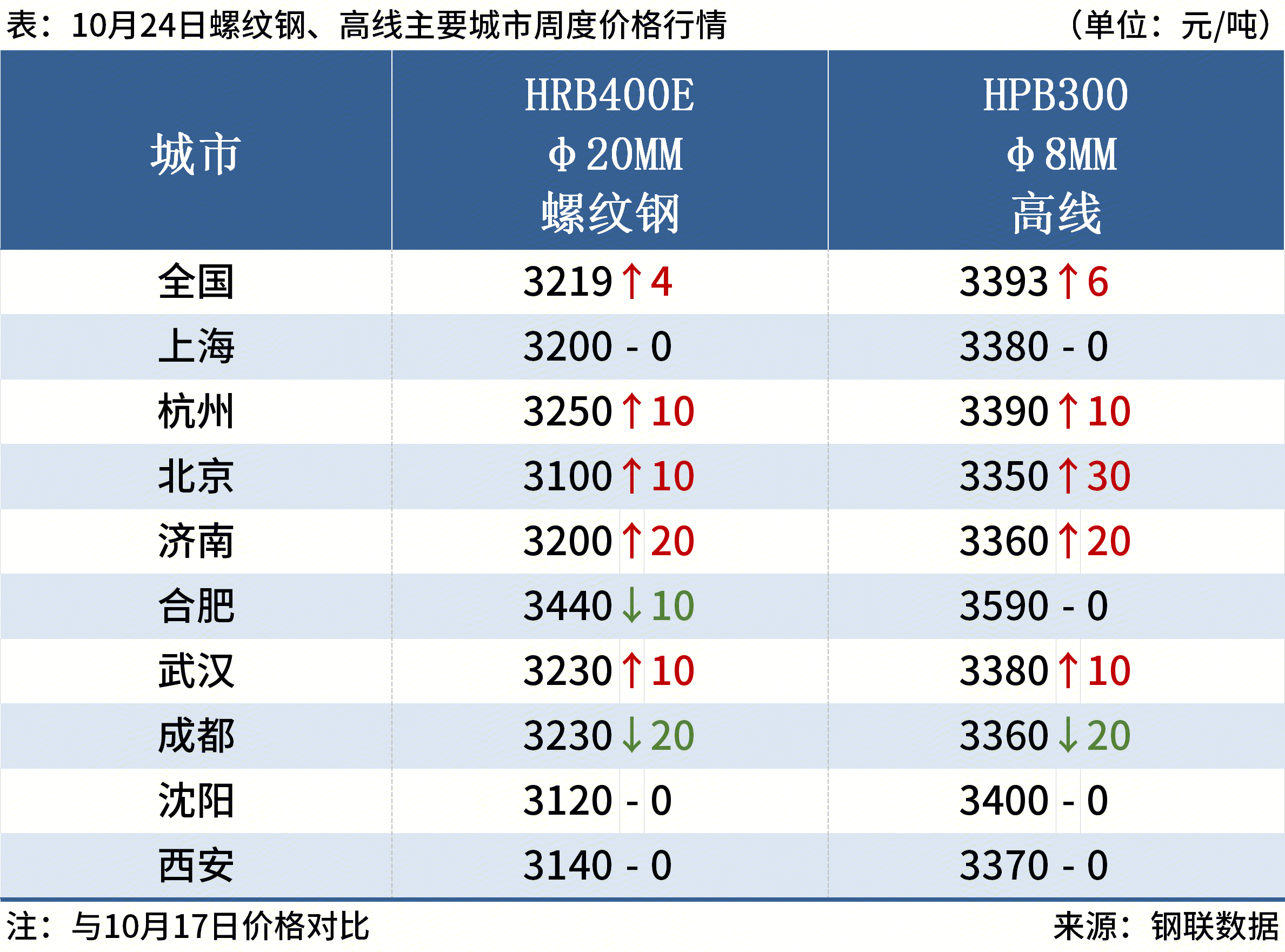 截至10月24日,世界重要都市20mm三级抗震螺纹钢均价3219元/吨,周环比上涨4元/吨;8.0mmHPB300高线元/吨。