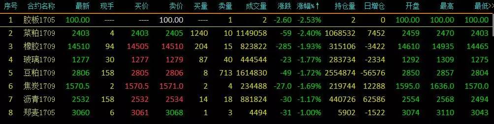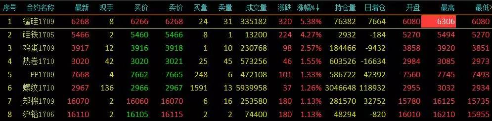 和讯期货动静 周三(4月26日)大宗商品涨跌分裂,下昼盘中,玄色系公众半坚持涨势,截至下昼收盘,锰硅暴涨5.38%,一度涨停,硅铁紧随其后,涨幅高达4.27%,热卷和螺纹涨幅回落,折柳涨1.55%和1.26%,别的,双焦均下跌,此中焦炭跌幅逾1%。农产物(000061,股吧)方面,鸡蛋仍上行,涨幅达2.57%,郑棉涨1.13%,下跌方面,两粕均现较大跌幅,豆粕跌1.72%,菜粕跌2.4%。化工方面,PP涨1.33%,橡胶跌1.93%,玻璃跌1.77%,沥青跌1.17%;有色金属方面,沪铅涨逾1%,沪铜、沪锌、沪铝和沪锡均现微涨。