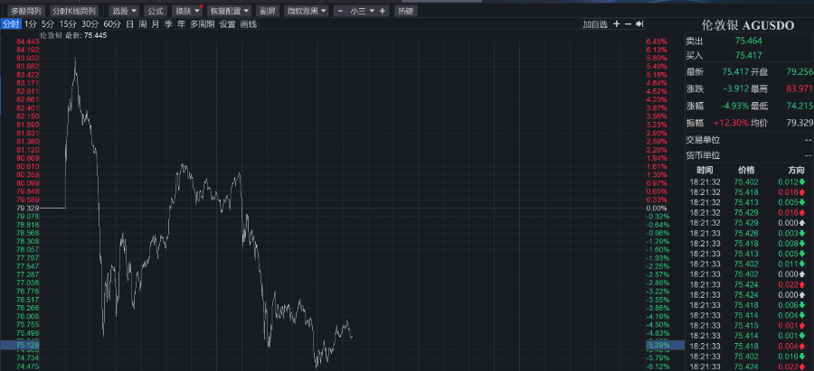 套保持仓交易保证金比例调整为16%2026年1月16日2025年12月29日,白银上演“蹦极跳”,早盘一度上涨5.3%,摸高83.971美元/盎司,一度迫近84美元/盎司,只是很疾就显示跳水走势,盘中联贯击穿83美元、82美元、81美元等9个整数闭口。截至北京年华18点,最低跌至74.215美元/盎司,一日之内涨跌近10美元/盎司,盘中振幅抵达12.3%。