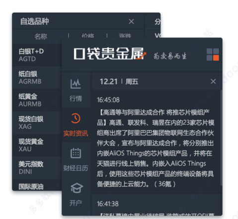 效用版的口袋贵金属增补财经日历倒计时指点,紧要财经资讯不再错过。财经资讯会集,模块隔离分明,便于您更速的获取资讯。