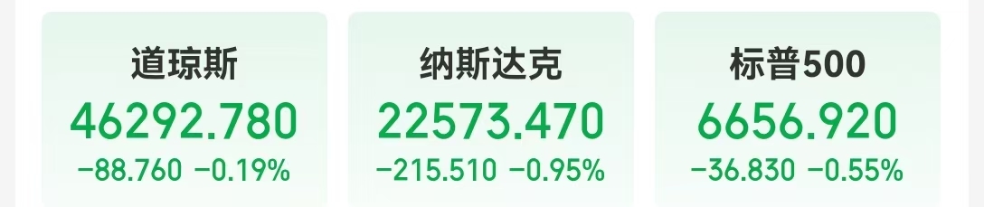 大型科技股广泛下跌,甲骨文跌超4%;亚马逊跌超3%;英伟达跌超2%,市值一夜蒸发1259亿美元(约合百姓币8954亿元);特斯拉、微软跌超1%。