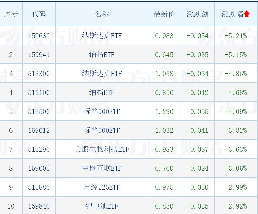 下跌方面,因为美股周二暴跌,道指重挫1276点,创2020年此后的最大单日跌幅,纳指跌逾5%,标普500指数跌破4000点闭口。跟踪美股的众只ETF今日全体大幅低开,截至收盘,跟踪纳斯达克的4只ETF普跌约5%。