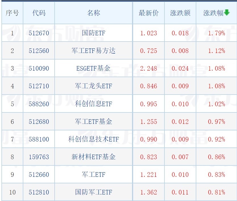 ETF涨幅榜中,有3只邦防军工干系ETF涨幅超1%;别的受科创板因素股金山办公、中微公司等个股逆势大涨,科改进闻ETF涨约1%。