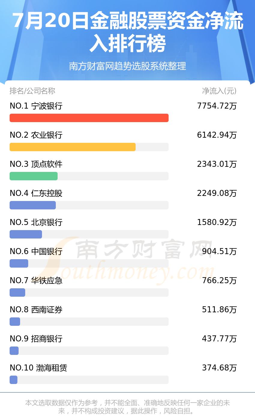 金融股票7月20日资金净流入境况来看,宁波银行位列第一位,主力净流入到达7754.72万元;农业银行排名第二,主力净流入为6142.94万元;极点软件排名第三,主力净流入2343.01万元。主力净流入排名前10的再有:仁东控股、北京银行、中邦银行、华铁应急、西南证券、招商银行、渤海租赁。
