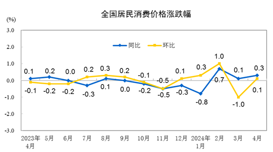 道达:这个周末揭橥的重磅数据确实挺众。起首来看物价指数,4月份CPI同比上涨0.3%,环比由降转涨,涨了0.1%。PPI同比降幅有所收窄。此前,Wind同等预期的CPI增幅是0.2%,Wind同等预期的PPI是-2.3%。可能说CPI数据是超预期的,而PPI数据不足预期。物价指数有涨有跌,总体偏中性。