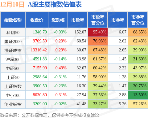 A股首要宽基指数方面,科创50的市盈率百分位较高,为95.49%。而创业板指的市盈率百分位较低,为33.27%。
