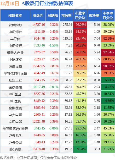 热门行业指数方面,软件指数的市盈率百分位较高,为96.06%。而800消费的市盈率百分位较低,为9.54%。