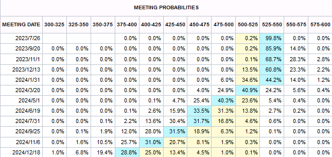 除了财报和AI音问外,周二颁布的美邦6月零售数据不足预期也显示,吃紧的劳动力市集照旧正在支持经济大盘保留增加,同时美联储最担心的经济过热题目也正在稳步缓解,市集仍预期美联储7月将实行终末一次加息。CME美联储察看器材显示,7月加息概率仍然亲近100%,然后几个月加息概率不大。