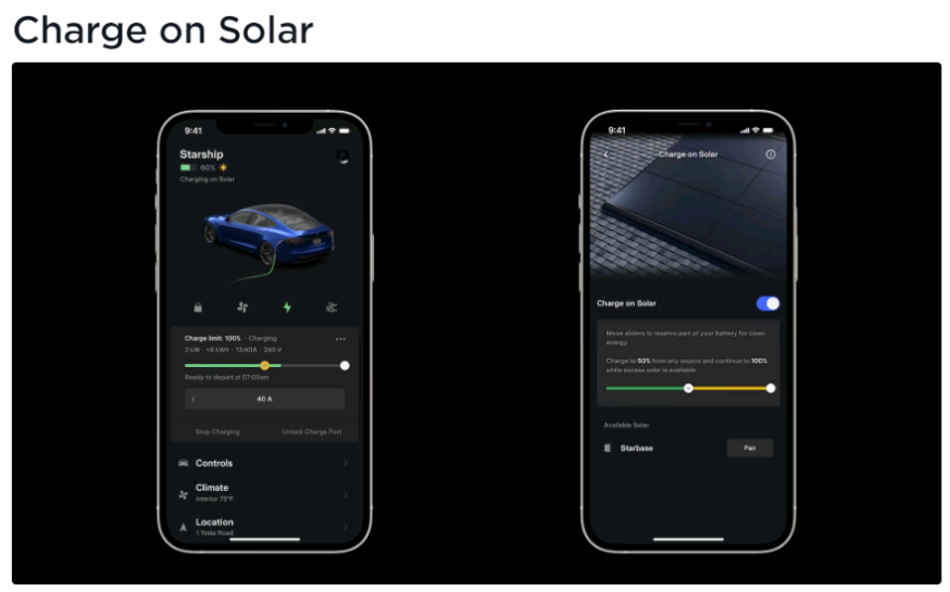 据媒体周二报道,特斯拉即日正式向美邦和加拿大地域推出了新的“Charge on Solar”(太阳能充电)性能,让特斯拉车主能够只操纵太阳能为自身的电动汽车充电。按照官网的APP截图,车主能够正在“Charge on Solar”性能中为车辆设定充电计划。比方将车辆前50%的电量设定为“能够还自于任何途径”,别的50%-100%的电量“仅通过太阳能”。