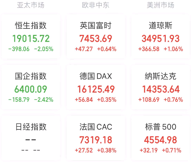 欧洲股市方面,英邦富时100指数小幅上涨0.64%,报7454点。法邦CAC40指数小幅上涨0.38%,报7319点。德邦DAX指数小幅上涨0.35%,报16125点。