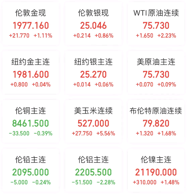 WTI原油主力合约收于每桶75.73美元,涨2.23%;布伦特原油主力合约收于每桶79.82美元,涨1.68%;隔夜上期所原油主力合约收于每桶582.20元,涨1.31%。