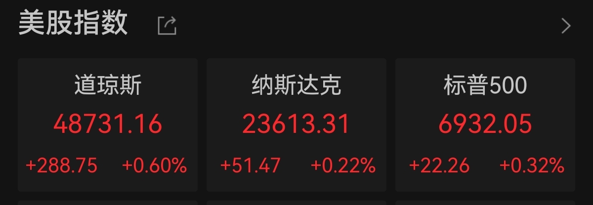 新浪财经期货首页刊用本网站稿件中新经纬12月25日电 美东时分周三,美股提前收盘,三大指数均录得五连涨,道指、标普500指数创收盘新高。截至收盘,道指涨0.6%报48731.16点,纳指涨0.22%报23613.31点,标普500指数涨0.32%报6932.05点。