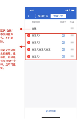 2、若有自界说分组,加自选时弹出“编辑分组”弹框,删自选时则从一起分组中删除该合约;