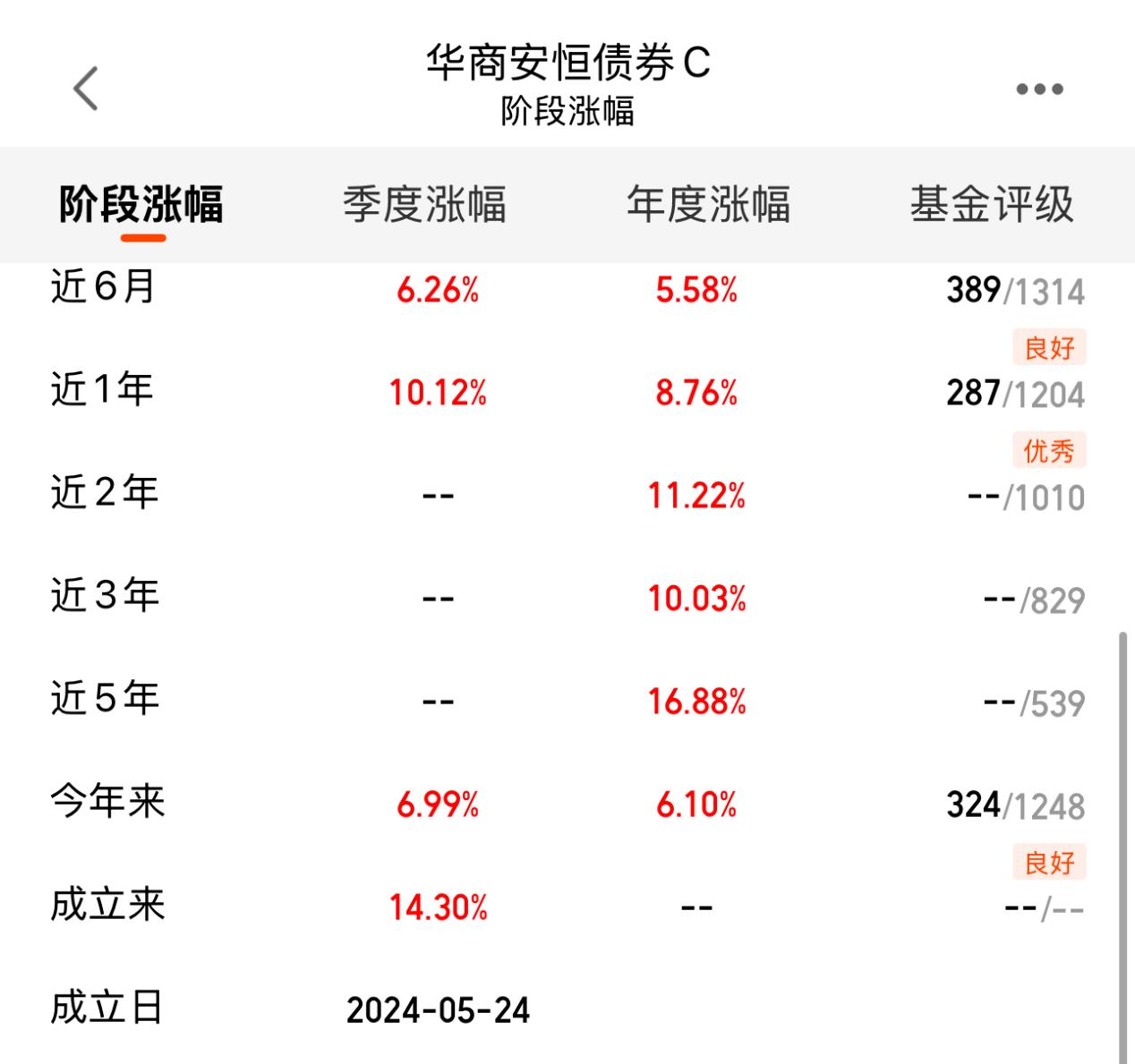 再看华商安恒债券自己,模范的固收+政策——债券资产占比≥80%,权力资产≤20%。这种摆设就很合理,债券打底保障基础盘,小比例权力巩固收益。我考虑了下它二季度的持仓,行业紧要分散正在电子、通讯、传媒、呆板这些倾向,都是既有滋长空间又有安乐边际的界限,看来基金司理选股如故有一套的。从事迹看,昨天单日就涨了0.14%,固然迩来市集切换有点调治,但永久事迹仍旧能打:近6个月涨6.26%,近1年涨10.12%,本年来收益6.99%,创建此后更是拿下14.30%的收益。要明了,这然则正在担任颠簸率的条件下做到的,性价比真没得说。