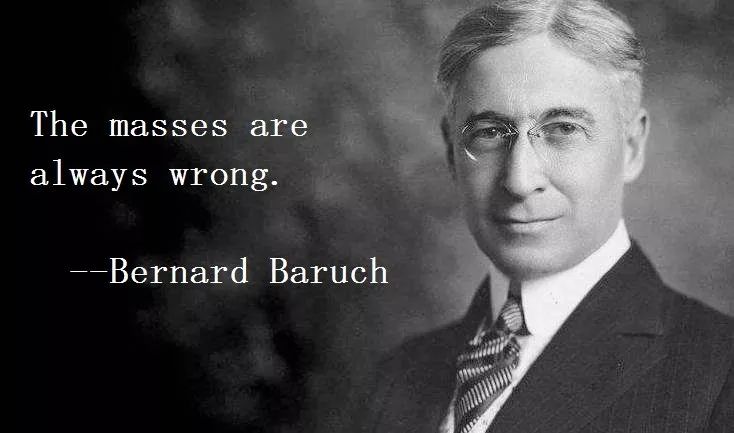 巴鲁克宗旨一个极度浅易的模范,来辨别何时算是该当买入的低价和该卖出的高位:当人们都为股市欢呼时,你就得判断卖出,别管它还会不会连续涨;当股票低廉到没人念要的时辰,你该当勇于买进,不要管它是否还会再下跌。人们通常惊讶巴鲁克的判决力,能掌管电光石火的时机。