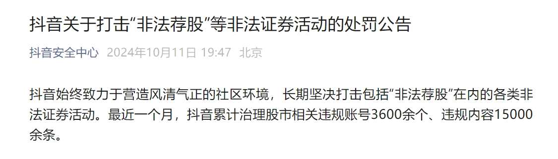 抖音安乐核心10月11日颁布的通告显示,抖音永久刚强冲击包含“犯罪荐股”正在内的各种犯罪证券举止。迩来一个月,抖音累计办理股市干系违规账号3600余个、违规实质15000余条。通告中抖音重申,厉禁各种“犯罪荐股”“股市黑嘴”作为,曾经涌现平台将采纳厉格门径实行办理。