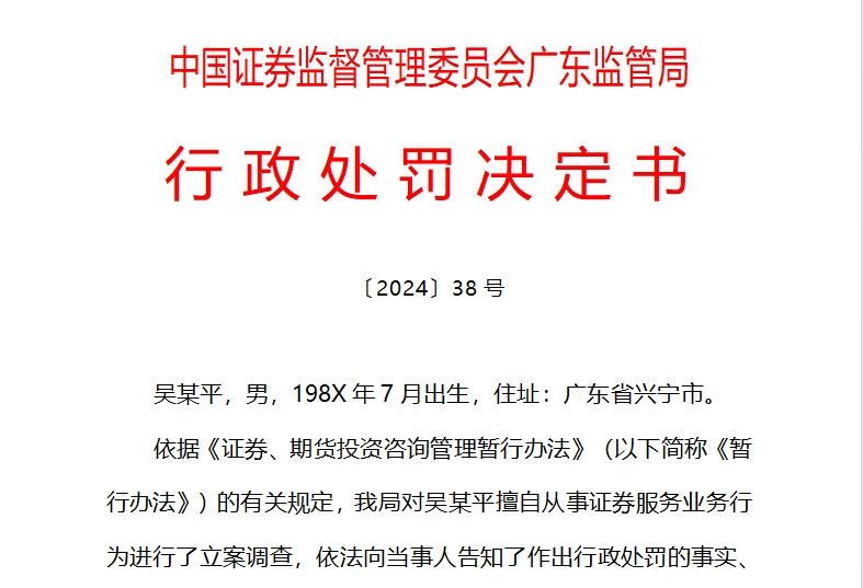 11月4日,广东证监局披露,吴某平允在视频课程、直播平分析保举股票,存正在未博得从事证券投资征询营业批准、供给直接或间接有偿证券投资征询效劳的违法原形,该局对吴某平私行从事证券效劳营业作为实行了立案侦察,决心充公吴某平从事犯罪证券投资征询违法所得255.17万元,并处以200万元罚款。