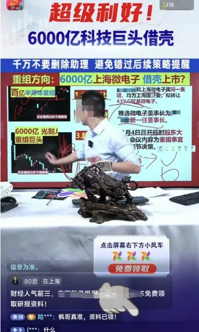记者正在短视频平台涌现,不少直播间主播的话术浮夸,往往会用“超等利好”“数千亿泼天高贵”“立时腾飞”等言语来诱导用户,存正在示意保举个股境况。当稠密投资者随同个体主播的犯罪荐股交易股票时,往往会落入他们的罗网。
