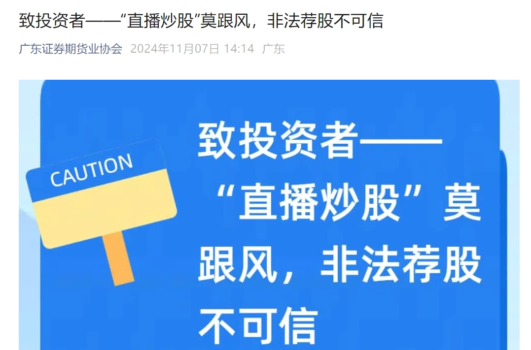 针对近期的“直播炒股”事项官方部分也已发声。11月7日,广东证券期货业协会颁布致投资者公然信,指点普遍投资者“直播炒股”或者颁布短视频公然保举股票均是违规的,也是不行托的,如正在干系平台涌现违规实质,可通过“举报”效力向平台反应。