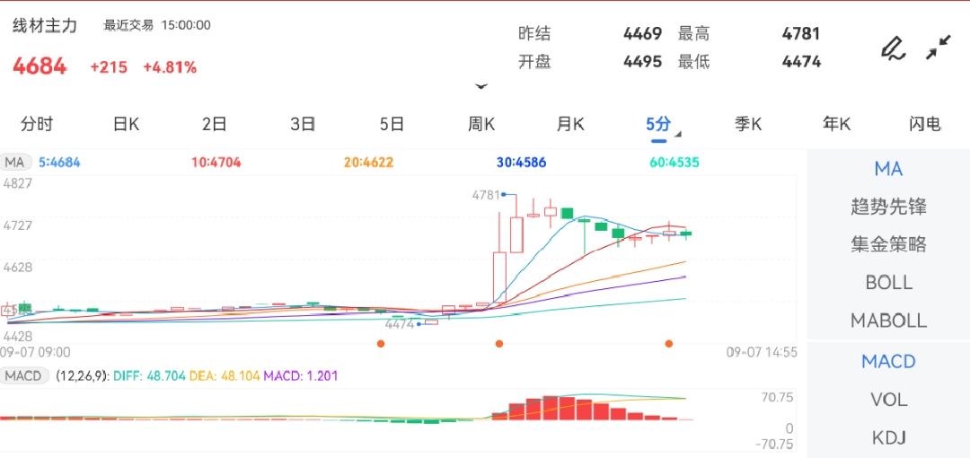 截止2023年8月24日下午15:00收盘2023/9/12期货稳赢简单方法金投网APP行情中央数据显示,截止2023年9月7日下昼15:00收盘,线材期货主力合约行情消息:最新价:4684,涨跌:215,涨跌幅:4.81%,成交量:3888手,开盘价:4495,昨收价:4498,最高价:4781,最低价:4474。