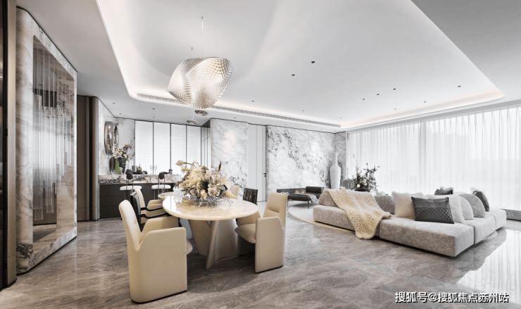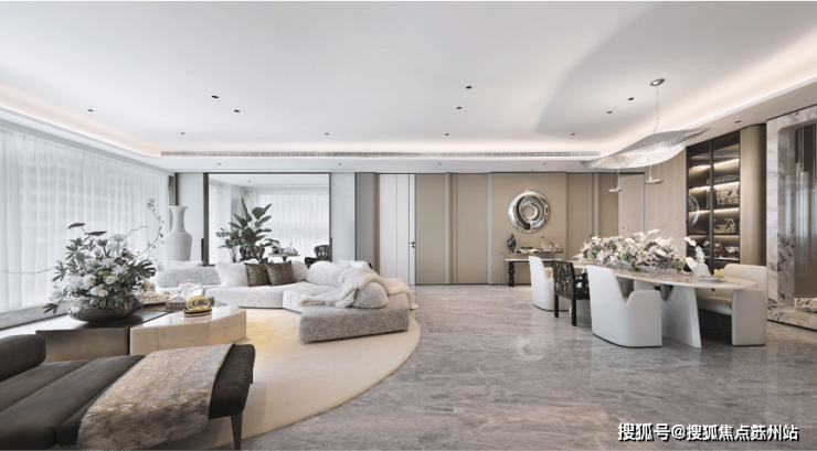 公区方厅第一眼的感触便是空旷,修筑面积超90㎡,思举办超大型party都没题目,而且南向开间有约19米,如许的标准能和市道上四五百方户型的客堂媲美了。完全安排格调以浅白色为主,客堂布景墙贴着大面积「芬迪白大理石」,弧形的制型配合木饰面,以及旅馆级的灯光安排,让全数空间看起来华侈又不失温馨。