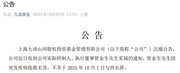 上海九颂江山股权投资基金拘束有限公司(以下简称“公司”)重痛告示,公司今天收到公司现实限定人、推行董事管金生先生宅眷的通告,管金生先生因突发疾病调停无效,不幸于2025年10月7日与世长辞。