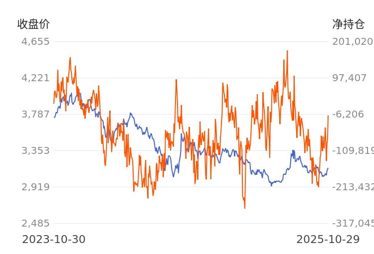 据统计,近两年代价和净持仓数据的干系系数为0.22,两者存正在弱正干系相干(同向性)。