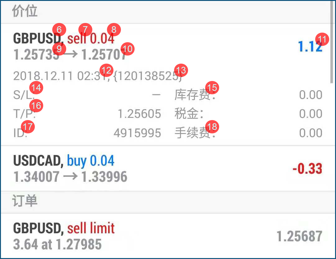 ⑥【GBPUSD】订单贸易钱币对种类。⑦【sell】指订单贸易类型(持仓/挂单)和众空目标(buy/sell),buy - 众单,buy limit - 挂单做众,sell - 空单,sell limit - 挂单做空 。⑧【0.04】订单贸易手数的巨细。⑨【1.25735】指订单的筑仓代价。⑩【1.25707】指持仓订单确当前代价,以及挂单订单目今可预设的筑仓代价。⑪【1.12】指持仓订单目今的浮动盈亏。⑫【2018.12.11 02:31】筑仓时代,指创筑订单的时代。⑬【 120138525 】订单注脚,以120发轫举动注脚的订单, 即为Fa呆板人所做订单。⑭【S/L】止损代价,指订单所筑设的止损代价。⑮【库存费】隔夜利钱或住宿费,正数为得到,负数为支拨。⑯【T/P】止盈代价,指订单所筑设的止盈代价。⑰【ID ]订单编号。⑱【手续费】筑仓时贸易商收取的手续费,Ava Trade 爱华不收取手续费 。