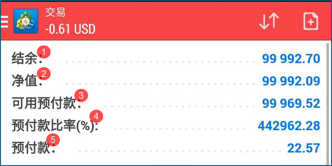 ①【盈利】余额,指贸易账户中总资金扣除已用预付款后残余的个别,不策动持仓中的浮动盈亏,以是正在筑 仓进程中、下一次筑仓或平仓之前,余额是固定稳固的。②【净值】指正在余额的根源上策动持仓中的浮动盈亏,即目今贸易账户中现实存正在的资金,正在持仓进程中,会随浮动盈亏变更。③【可用预付款】投资人正在筑仓之后,扣除已用预付款和持仓中的浮动盈亏,此时贸易帐户中残余的资金被称为可用预付款。④【预付款比率】预付款比例,指贸易账户中的净值和筑仓时已付出的保障金之间的比值。⑤【预付款】已用预付款,投资人正在筑仓之后,筑仓时付出的保障金被称为已用预付款。