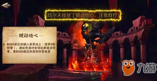 撼动地心终了后,小队要立刻回到boss跟前 ,提防boss使出火焰攻击 !若第一怨恨不正在近战限制,则对该怨恨玩家变成中量虐待 ,并附带着加热debuff ,玩家受到火焰攻击虐待加倍 。