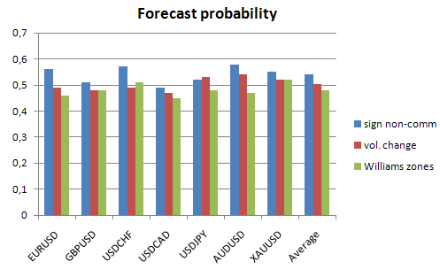 正如咱们所睹,非贸易持仓交往职员的净长仓取得了最佳的预测结果。最差的结果来自威廉目标区域。值 0.48 呈现白色烛形的概率为 0.52,假使威廉目标为超买,倘使是超卖则为玄色。于是,它通过威廉目标呈现的操纵大局是分歧理的。也许,操纵较大的时候外会使结果获得改观:月或更大时候外。咱们操纵了演示效劳器和 COT 告诉中一起可用的交往种类。