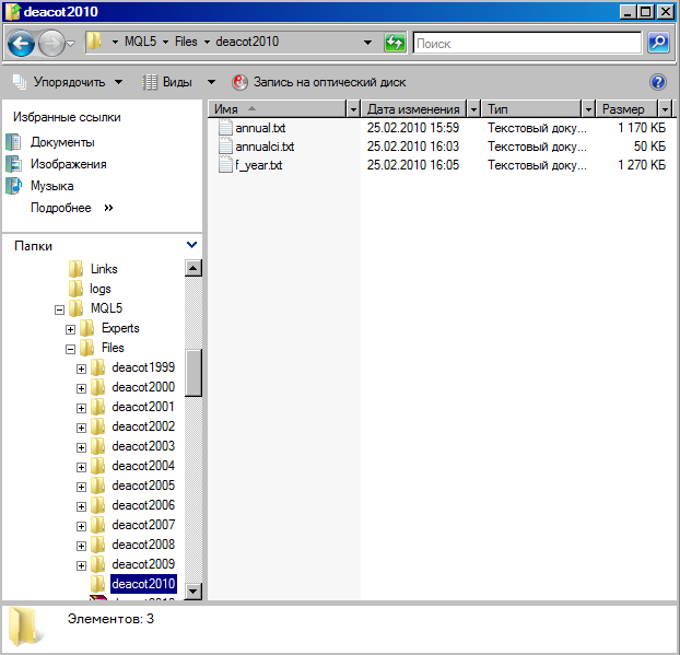 必要下载一起这些文献并将它们解压缩至客户端安置目次的\MQL5\files\文献夹中。每年必要为其创筑名为deacotXXXX的孤单文献夹,个中XXXX对应于年号。云云一来,咱们会获得下述文献夹构造: